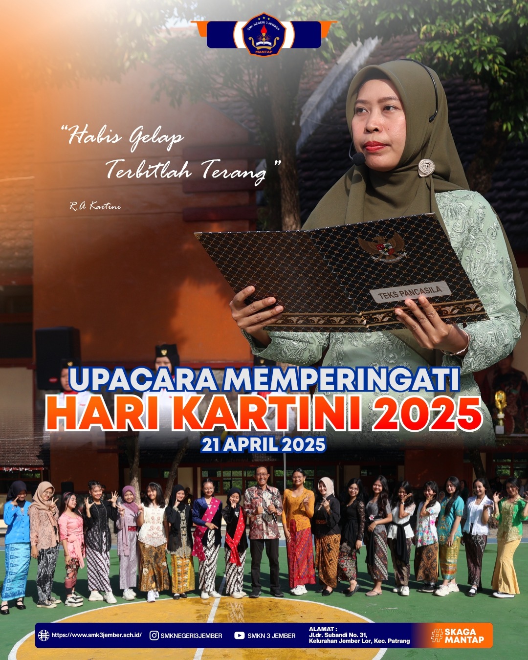 SMKN 3 Jember menggelar upacara peringatan Hari Kartini 2025 pada Senin pagi (21/4) di halaman sekolah. Upacara berlangsung dengan khidmat dan diikuti oleh seluruh siswa, guru, serta staf sekolah sebagai bentuk penghormatan terhadap perjuangan Raden Ajeng Kartini dalam memperjuangkan hak-hak perempuan di Indonesia.