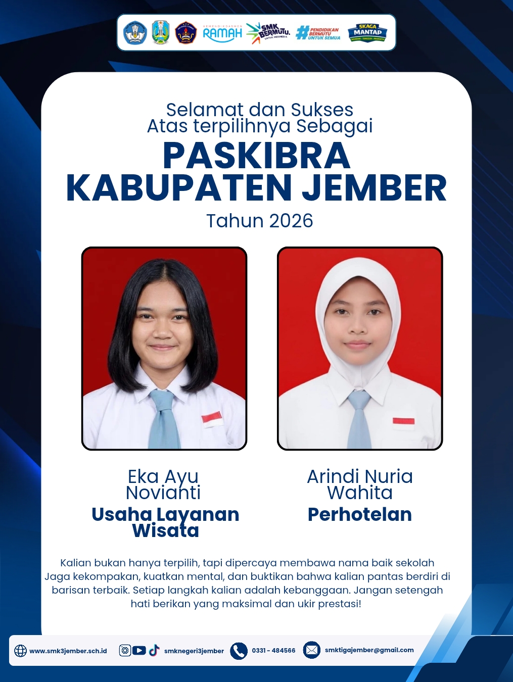 Selamat untuk Eka Ayu Novianti dan Arindi Nuria Wahita yang berhasil lolos sebagai Paskibra Kabupaten Jember 2026. Ini adalah bukti bahwa disiplin, kerja keras, dan konsistensi selalu menemukan jalannya.